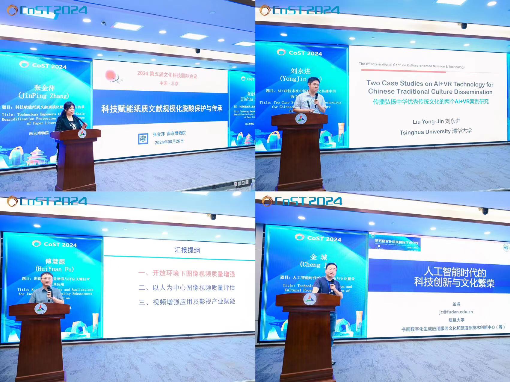 本次会议邀请到南京博物院张金萍研究员、清华大学刘永进教授、北京邮电大学傅慧源教授以及复旦大学金城教授,分别以《科技赋能纸质文献规模化脱酸保护与传承》《传播弘扬中华优秀传统文化的两个AI+VR案例研究》《图像视频质量增强与评估关键技术及其应用》和《人工智能时代的科技创新与文化繁荣》为题作主旨报告。